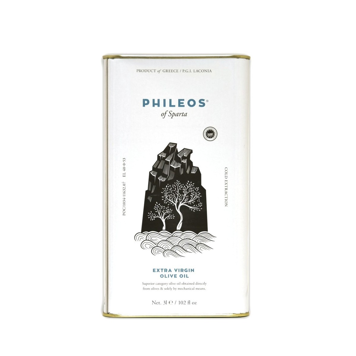 Bidon métallique contenant 3L d'huile d'olive extra vierge, 80% Koronéiki et 20% Athinolia, extraite à froid par des procédés exclusivement mécaniques et conditionnée sur le terroir par l'Union des Coopératives agricoles KASELL. Certifiée non OGM pour la production agricole, AGROCERT pour la production d'huile d'olive IGP Laconia, ISO9001/22000/22005 et IFS Food pour la mise en bouteille et le packaging, KASELL a reçu en 2017 et 2019 les prix Olympia Health & Nutrition de la plus haute valeur nutritionnelle et Oleocanthal International Society pour ses recherches en faveur de la santé. PHILEOS a reçu des médailles d'Or aux concours de Londres et de New York 2017, la médaille d'argent qualité à Londres en 2018, une distinction à Athènes en 2019, la médaille d'Argent à New York en 2020 et d'Or en 2021 (cf. onglet Documents Joints).