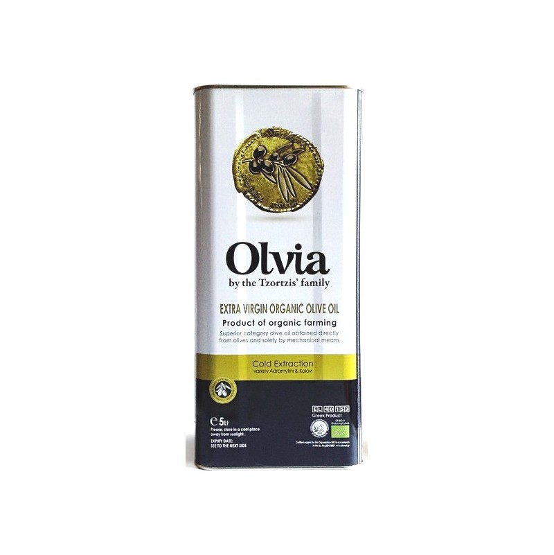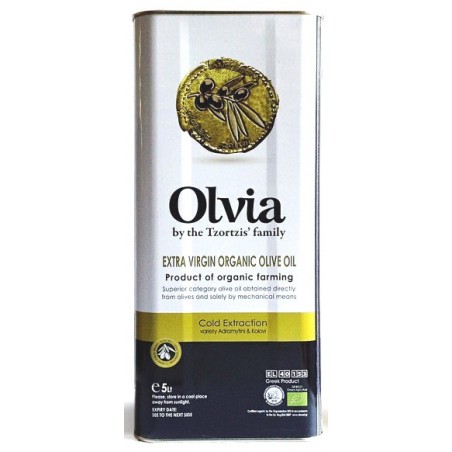 Bidon métallique contenant 5 litres d'huile d'olive extra vierge BIO IGP Lesvos, 80% Adramatini et 20% Kolovi, extraite à froid par des procédés exclusivement mécaniques et conditionnée sur le terroir de l'appellation d'origine. Certifiée AGROCERT pour la production d'huile d'olive IGP Lesvos, DIO (ΔΗΩ) pour sa production oléicole BIO, ISO22000:2005 pour son moulin à huile et son unité de conditionnement, l'oliveraie Tzortzis a été distinguée à maintes reprises pour OLVIA, notamment au concours mondial des huiles d'olive BIO en Italie (médailles d'Or en 2012, 2015, 2016, 2018, 2020, 2022 médailles d'argent en 2010, 2014, 2017 et 2019) aux concours internationaux ATHENA (médaille d'Or en 2011, 2016 et 2018, médaille d'argent en 2013, 2020 et 2021), de Londres et de New York.