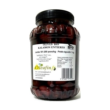 Description : olives Kalamata BIO entières calibre Jumbo 18/20 en saumure, conditionnées en PET translucide avec couvercle vissé