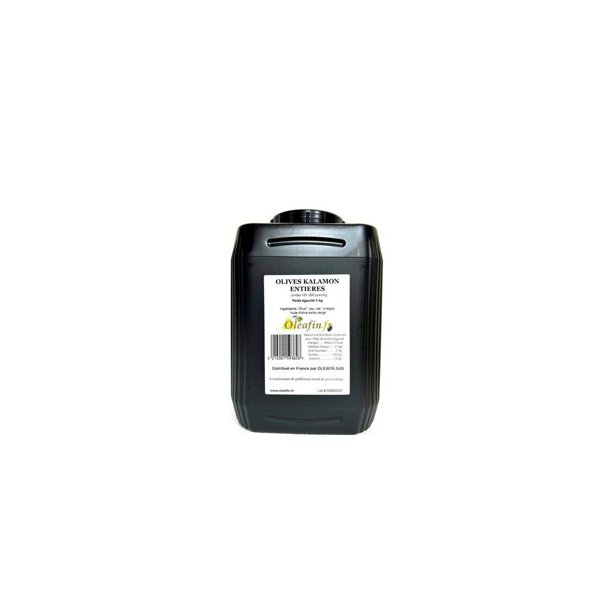 Description : 5 kg d'olives Kalamοn entières calibre Jumbo (180-200 pièces/kg) en saumure modérément salée au vinaigre