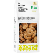 Ingrédients : farine de blé BIO, jus d'orange, sucre, sésame, tsikoudia, levure Baking Powder, canelle, clous de girofle, eau gazeuse, sel, eau, huile d'olive extra vierge.