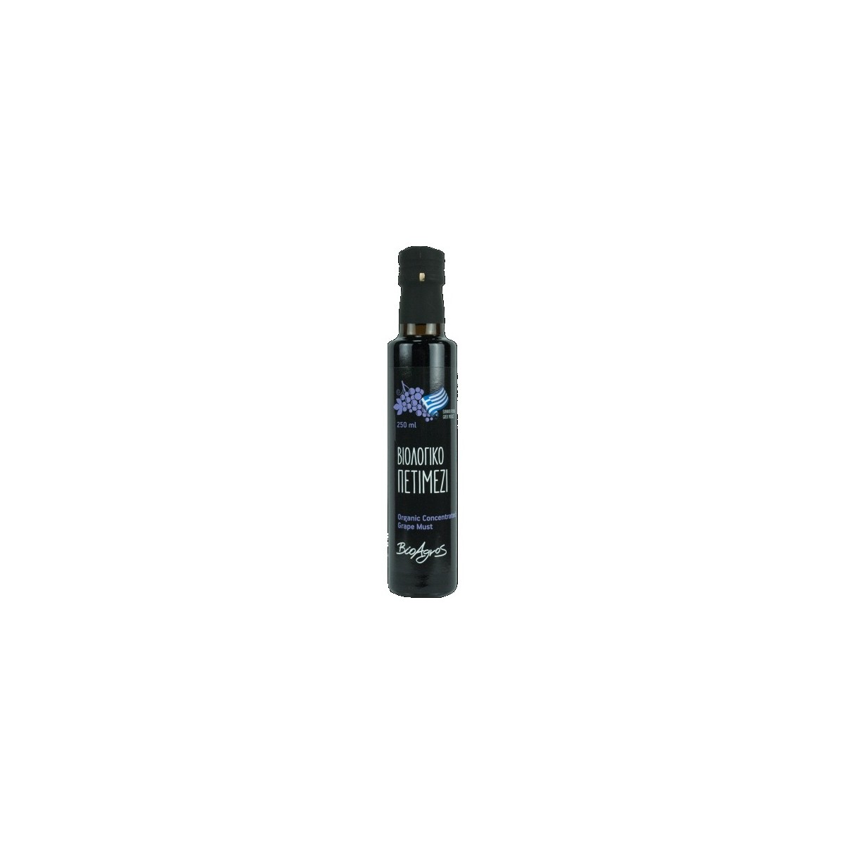 Bouteille de verre dorica contenant 250ml de sirop de moût de raisin, mis en bouteille par BIOAGROS, entreprise certifiée BIO CE 834/2007, ISO9001:2008, ISO 22000:2005 (HACCP) et IFS Food.