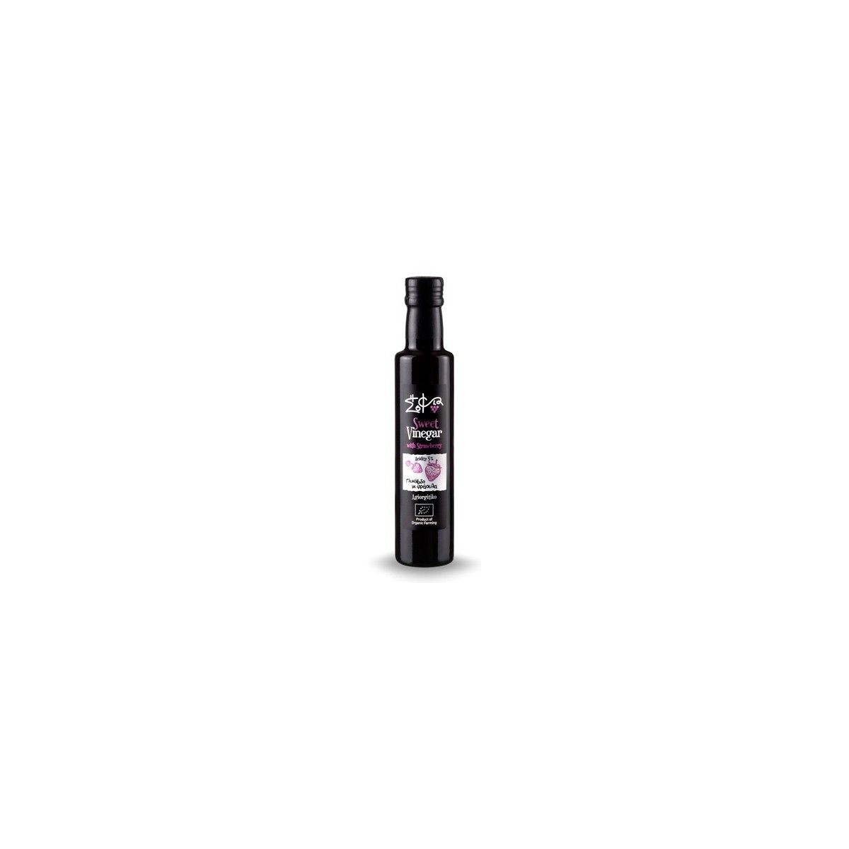 Bouteille de verre dorica contenant 250ml de vinaigre aigre-doux BIO à la fraise, produit et mis en bouteille par SOFIA TIS PHYSIS certifiée BIO UE 834/2007. Producteur certifié USDA NOP, ISO9001:2008 et ISO22000:2005.