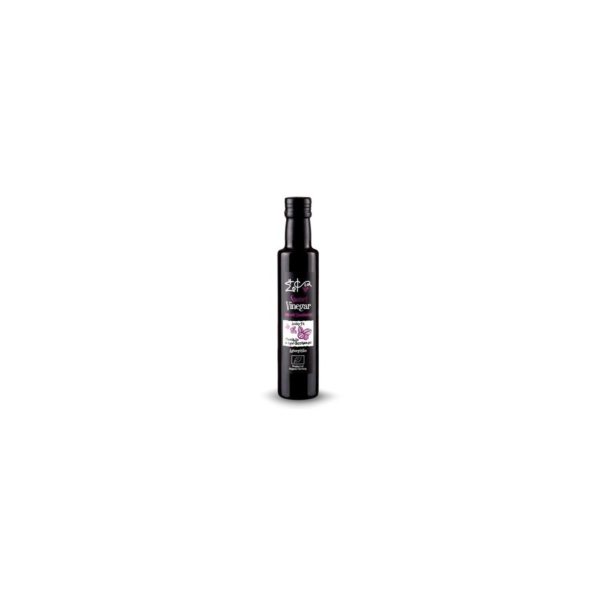 Bouteille de verre dorica contenant 250ml de vinaigre aigre-doux BIO aux mûres sauvages, produit et mis en bouteille par SOFIA TIS PHYSIS, entreprise certifiée BIO selon règlement UE 834/2007, USDA NOP, ISO9001:2008 et ISO22000:2005.